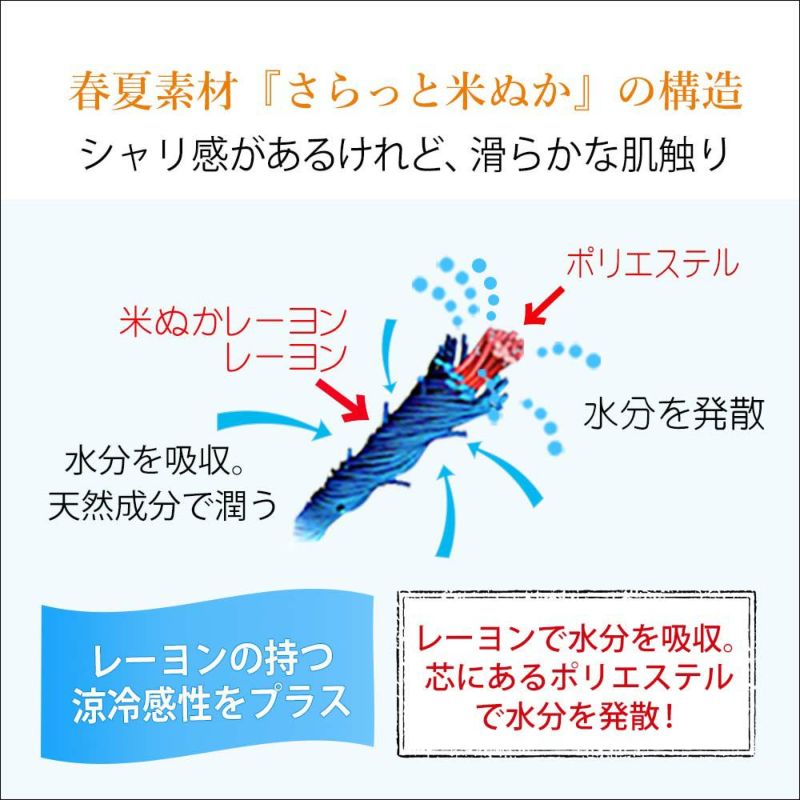 古来からスキンケアとしても使われてきた米ぬかには、γ-オリザノールやフェルラ酸などの美肌成分がたくさん詰まっています。γ-オリザノールやフェルラ酸などの美肌成分を更に増強して糸に練り込みました。『米ぬか繊維』の春夏素材として誕生したものが「さらっと米ぬか」です。シャリ感があり、さらっと気持ちよく履いて頂けます。