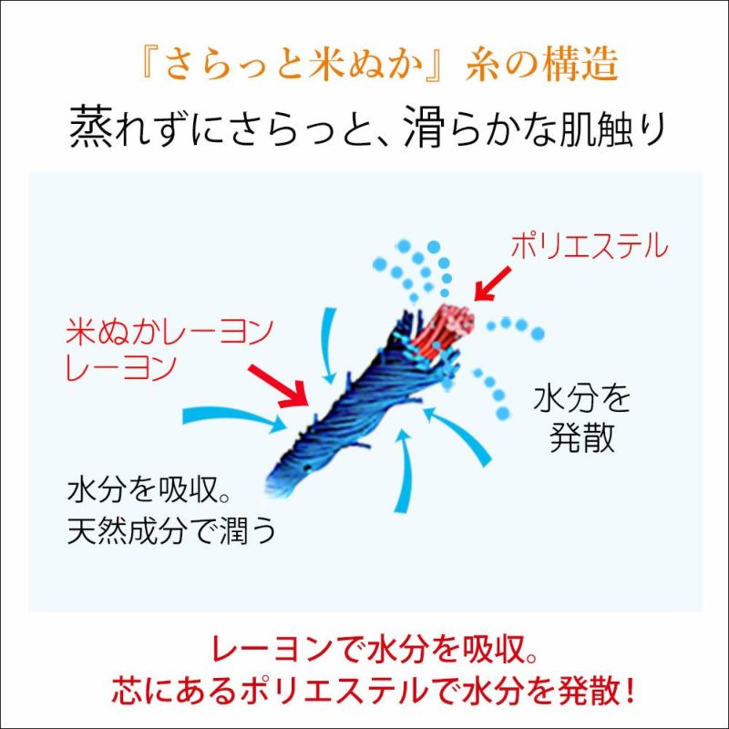 「さらっと米ぬか春夏素材」は、「米ぬか綿・レーヨン(通年素材)」に比べると、生地にレーヨンの割合が多い為、フィット感がございます。 その為、さらにゆったり、締め付けないように、糸使いと編み組織を見直しました。 ※締め付け感のなさには個人差がございます。