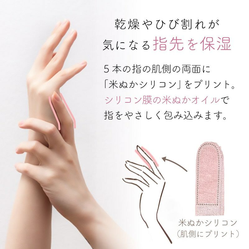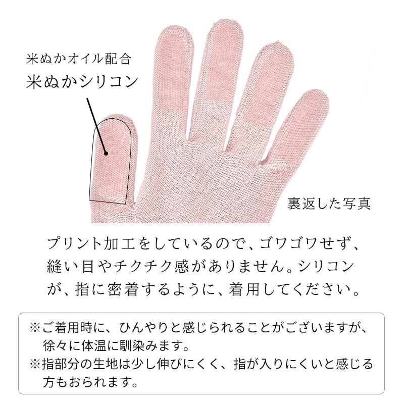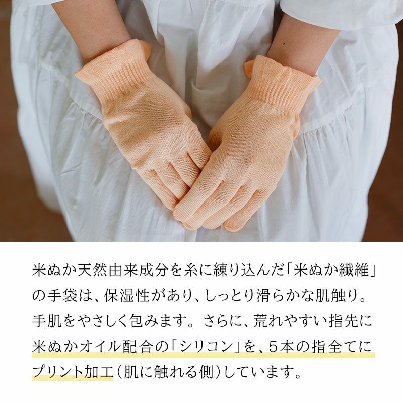 米ぬか天然由来成分を繊維に練り込んだ「米ぬか繊維」の手袋は、保湿性があり、しっとり滑らかな肌触り。荒れた手肌をやさしく包みます。さらに、荒れやすい指先に米ぬかオイル配合の「米ぬかシリコン」を5本の指の両側(手袋の肌に触れる側)にプリント加工しています。「米ぬかシリコン」で、荒れやすい指先の水分の蒸散を防いで、優しく保湿します。着用を続けて頂くと、しっとり「潤い」を感じる!とご好評を頂いています。