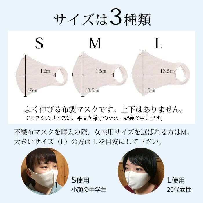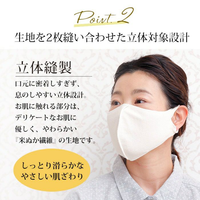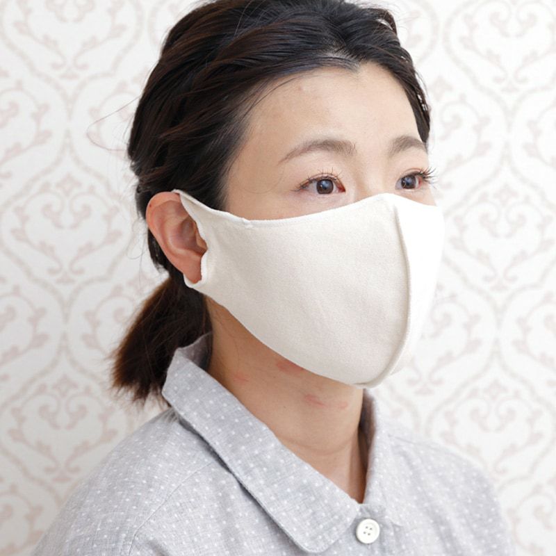 生地を2枚合わせて、立体になるように中央で縫製しました。全方向にやわらかく伸びる生地がお顔にやさしくフィットします。日本の職人が全ての工程にこだわって丁寧に作りました。 紙マスクによるかゆみや肌あれが気になる方の肌ケアにもおすすめです。