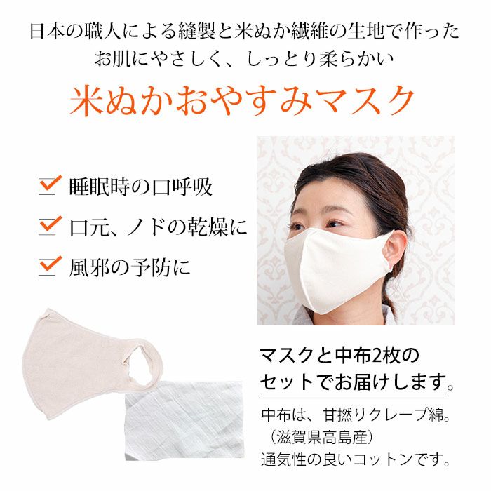 『米ぬか繊維』から生まれた、デリケートなお肌にやさしく伸縮性のある素材【NUUKA (ヌーカ) ®】で作った『米ぬかおやすみマスク™』です。日本で最初のスキンケア「米ぬか」 の天然由来成分を糸に練り込んだ『米ぬか繊維』。やさしい付け心地をお試しください。