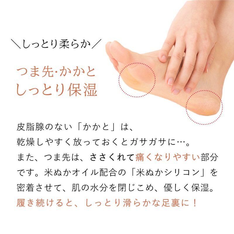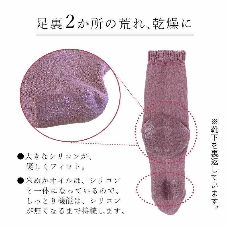 鈴木靴下の米ぬかソックスは、保湿性のある「米ぬか繊維」で編み立てています。しかしながら、かかと部分は通常よりも角層が厚く、保湿性のある素材であっても短期でのかかとケアは難しい・・・。 「頑固な部分には頑固な手立てを!」ということで、荒れやすいかかと部分にシリコンをプリント加工しました。