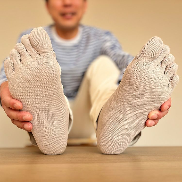お客様のご要望に応えた「締め付けない×五本指」の米ぬかソックスが登場!敏感肌や乾燥肌にも安心な米ぬか繊維と、締め付けを感じさせない、足の形状にフィットするよう編み立てられた、特許取得済(特許第6971081号)の特殊構造で、長時間の立ち仕事や忙しいデスクワーク、リラックスタイムにも最適です。五本指靴下は、足指が1本ずつ分かれているため指が自由に動かせ、指の間のムレや臭いの防止に効果的。消臭機能で快適な足元を保ちます。ぜひ、肌に優しい日本製のソックスをお試しください。