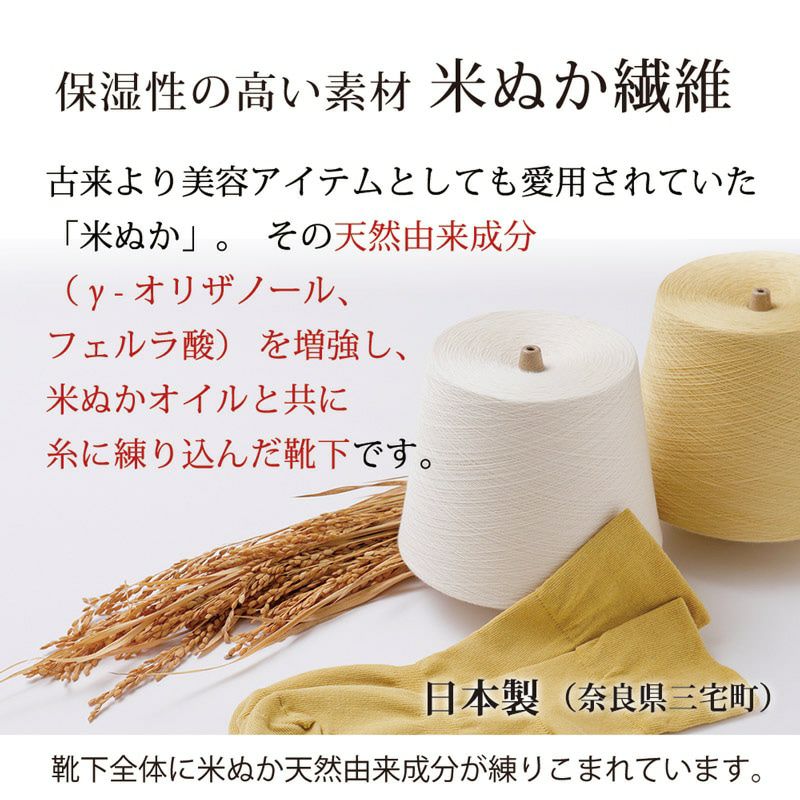 「米ぬか繊維」で作った、保湿性の高い、しっとり柔らかく、肌に優しい靴下です。自社で繊維から開発し、奈良の自社工場で1足1足丁寧にお作りしています。しめつけない。けれどズレにくい構造の靴下です。靴下のゴムがきつい、くい込みやゴム痕のかゆみがつらいという方や、デスクワークや立ち仕事による、足のむくみでお悩みの方だけでなく、カサカサ 乾燥肌 敏感肌の方にもおすすめの靴下です。無地ソックスはオールシーズン使い勝手が良くサンダルとも相性が良いです。