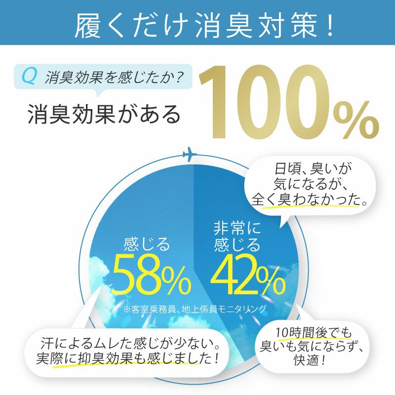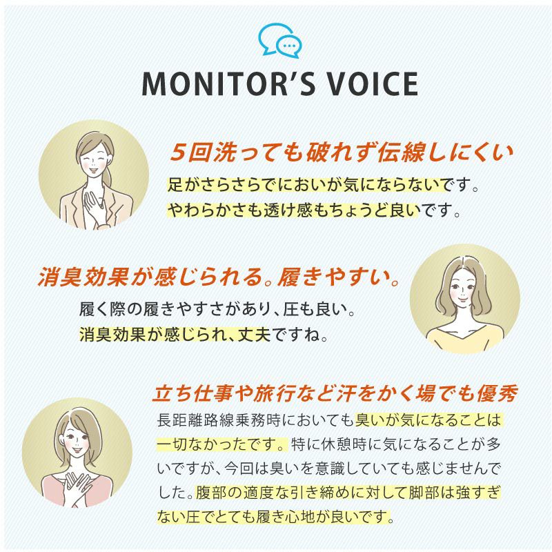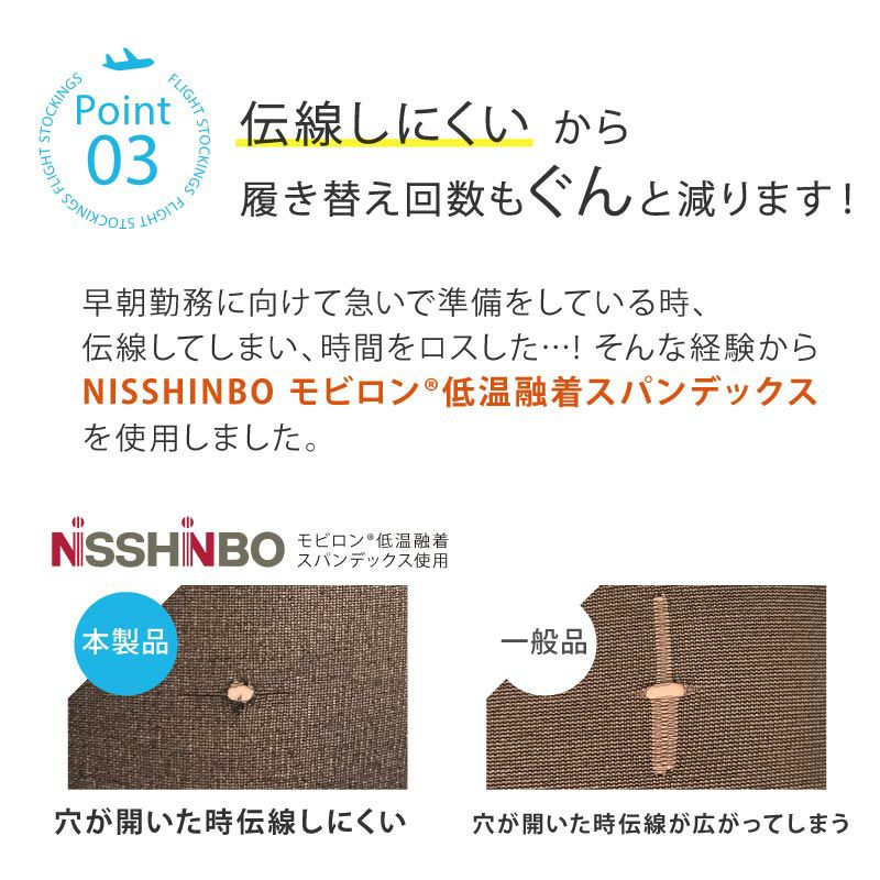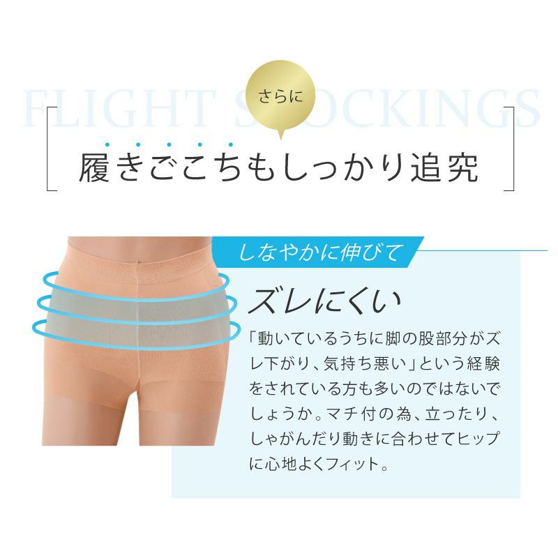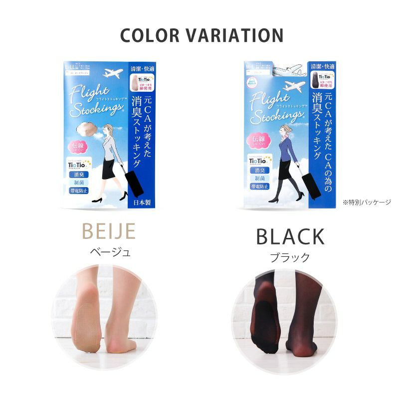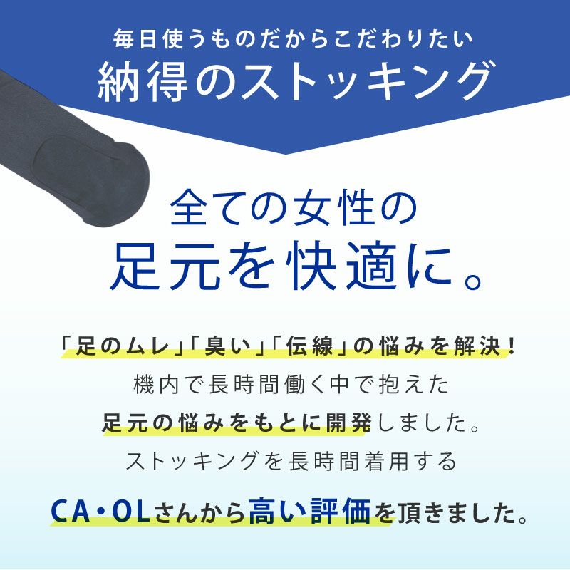 消臭・清潔・快適!元CAが開発した日本製ストッキング Flight Stockingsは、元CAが機内での長時間作業中に抱えた足元の悩みの経験をもとに、汗、ムレ、臭い、またストッキングの伝線の悩みを解決するために開発された消臭ストッキングです。ストッキングを長時間着用するOLさんにおすすめ!
