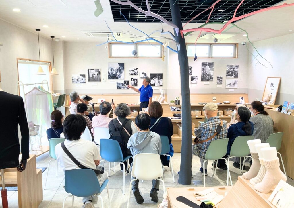 その後、米ぬかから糸が生まれるまでの製造工程を映像を通してご覧いただいたあと、実際に製品を手に取って手ざわりや色合いを確かめながらお買いものも楽しんでいただきました。