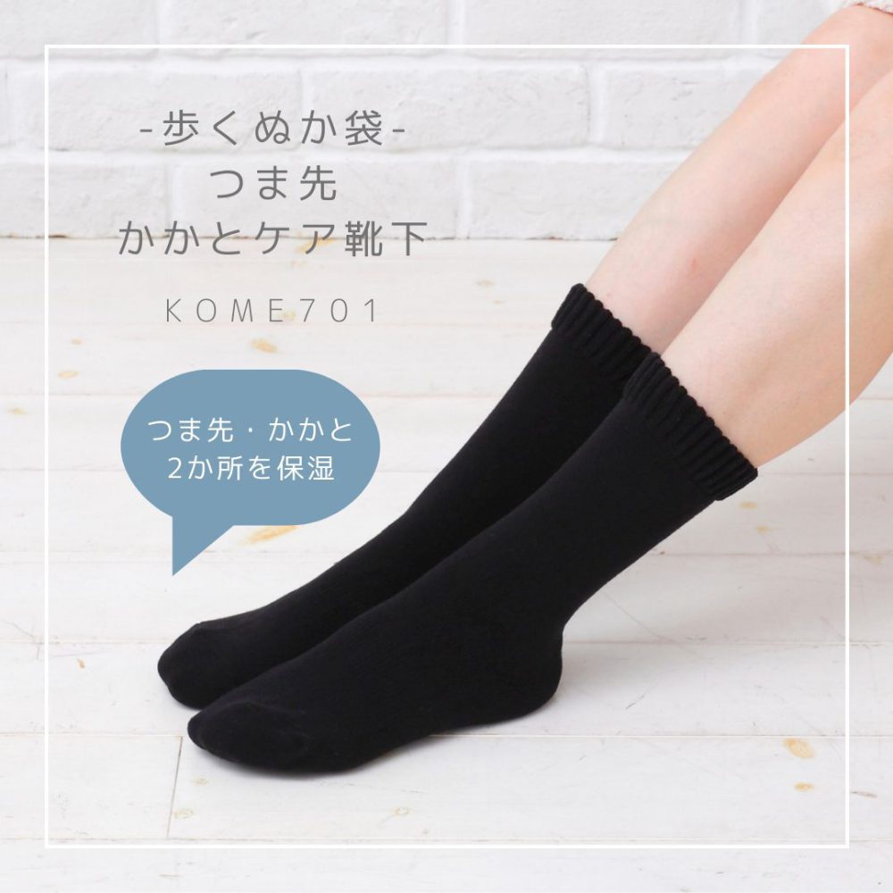 鈴木靴下の米ぬかソックスは、保湿性の高い素材「米ぬか繊維」で編立ており、靴下自体にも保湿機能があります。
