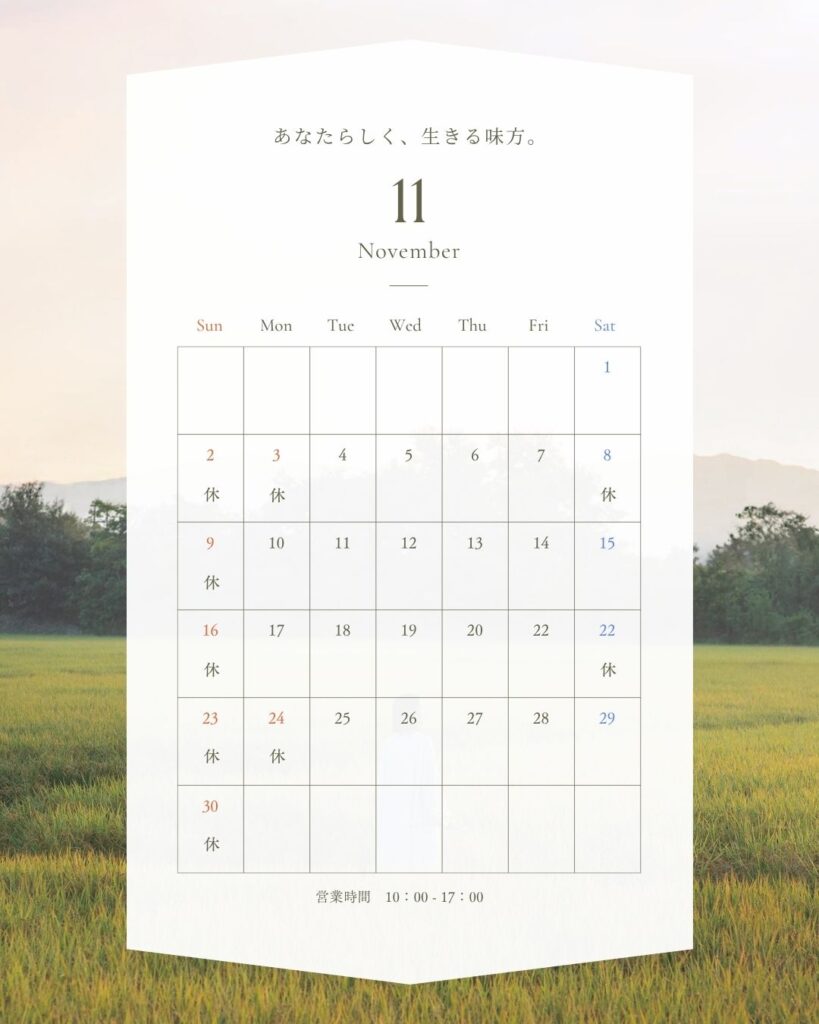 木々の葉が色づき、吐く息が白くなる季節になりました。足元からあたたかさを感じたくなるこの頃、実店舗から11月の営業日のお知らせです。