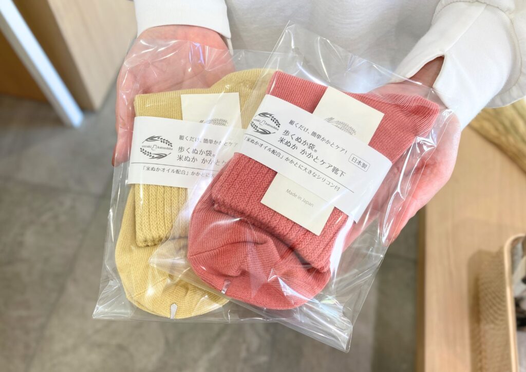 店頭では、新作の〈NUKATO〉米ぬかインナーもお取り扱いいただいており、靴下や温活アイテムと組み合わせた、ギフト提案も充実されています。