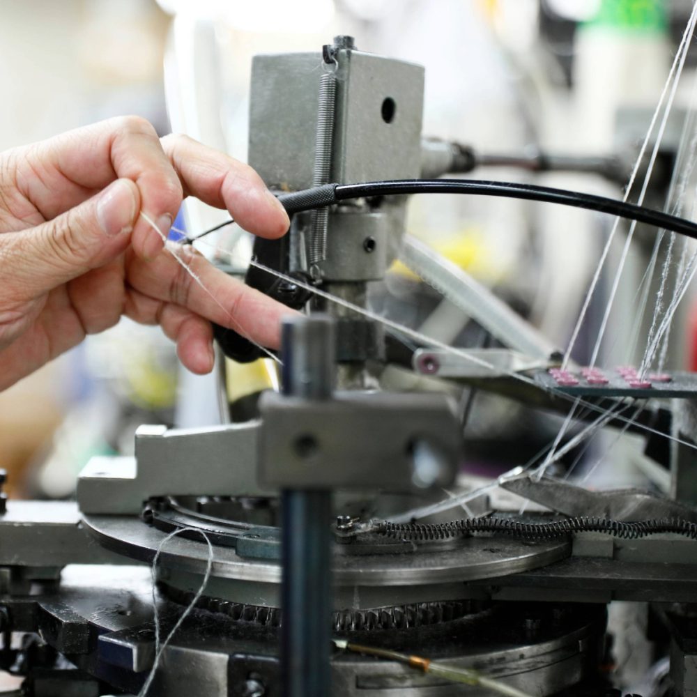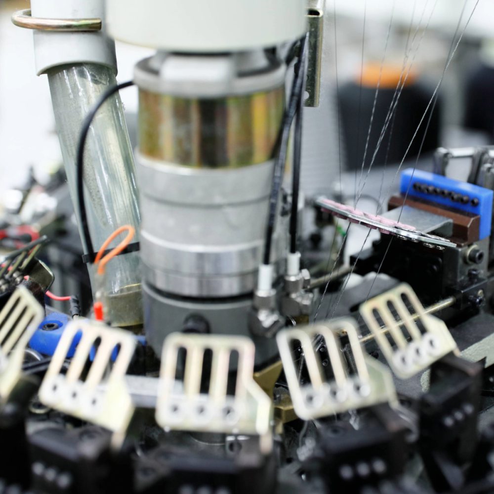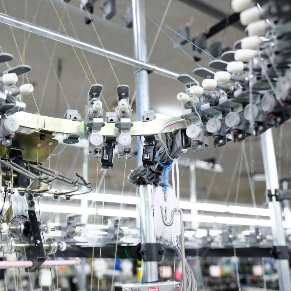 編機はそれぞれの糸や生地の厚みに対応するため様々な針数があり、鈴木靴下の靴下は、84本~200本の針で編み立てられます。