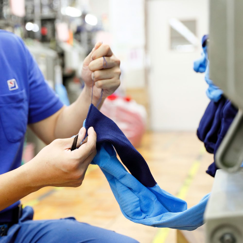 長い一本の筒状に編みあがった靴下を一枚一枚切り離し、一つずつ切りばさみでカットしていきます。