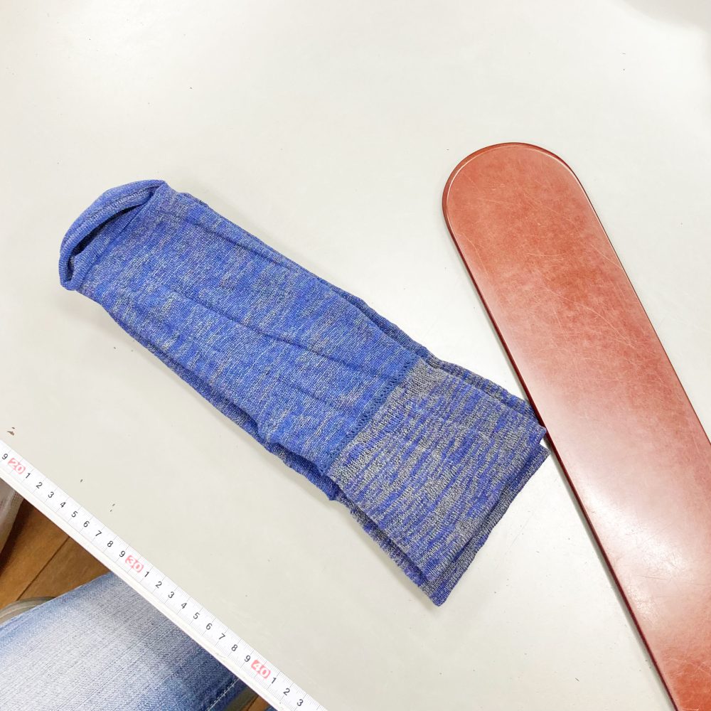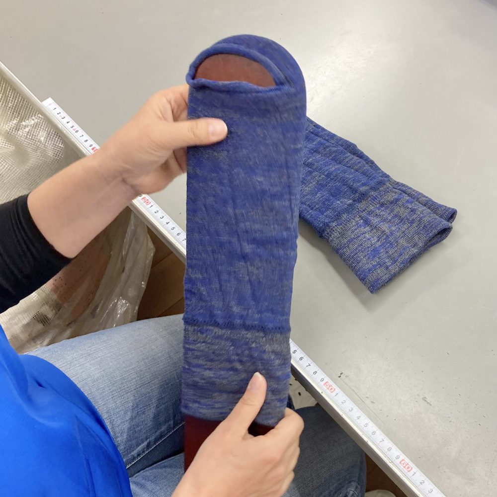 次の工程でのつま先を縫い合わせる準備の為、一枚づつ裏返しにする作業を手作業で行います。