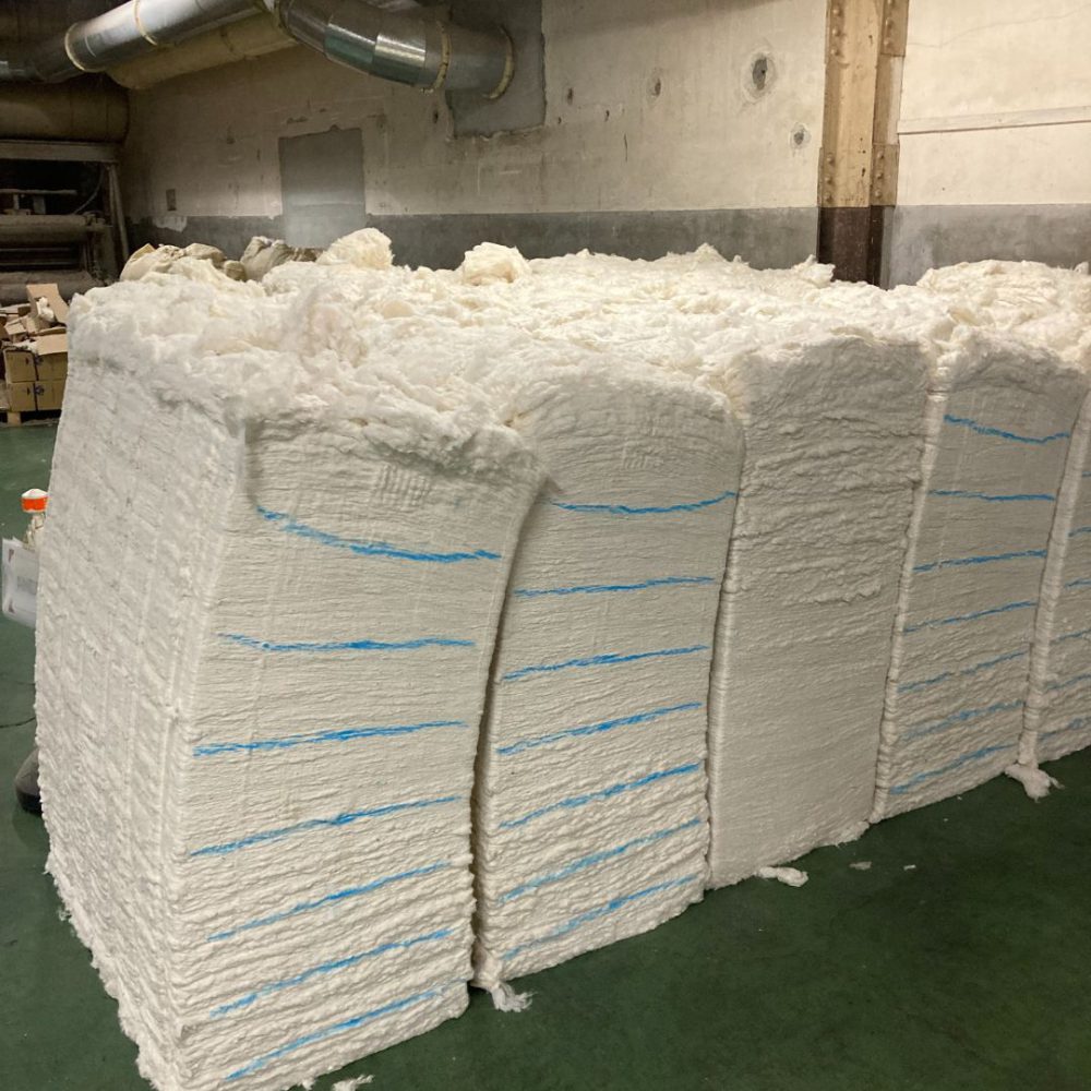 圧縮された綿をほぐし、葉かすや種子片、砂ぼこりなどのゴミを取り除きます。この作業では「混打綿機」という機械が使われます。ここで綿は、まるで魔法のようにふわふわのシート状に変わります。