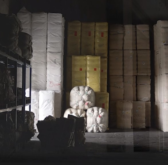 「米ぬか成分が練り込まれたレーヨンの棉」が工場に到着し、糸になるその瞬間を待っています。