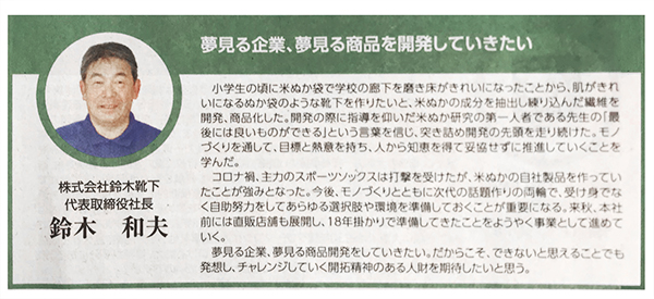 こんにちは。鈴木靴下です。鈴木社長からのメッセージが年末28日に奈良新聞に掲載されました。これからも、みなさまに喜んで頂ける商品の開発や情報を発信します!どうぞよろしくお願いします。