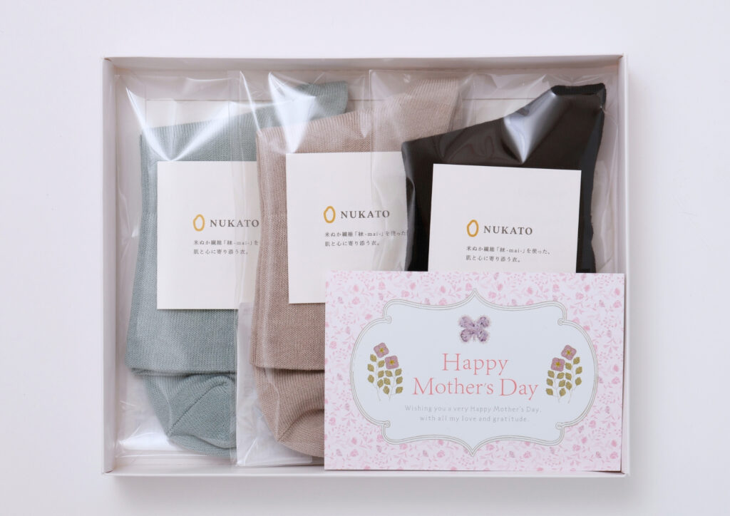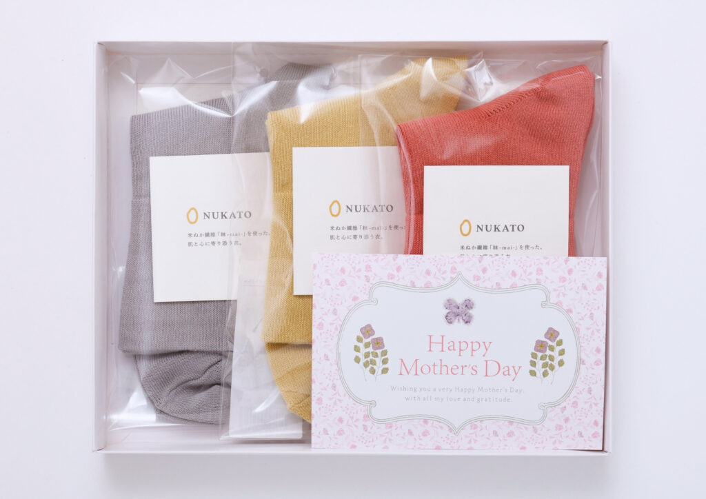 NUKATOの母の日ギフトは、ギフトボックスに入った3足セットと、ギフトカードを添えてお届けします。
